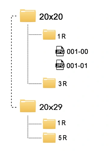 Чтобы избежать путаницы при обработке заказов, используйте единый формат именования файлов — ХХХ-YY.jpg, где:
