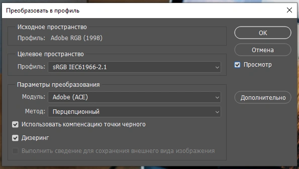 Если Вы всё же работаете в AdobeRGB, важно корректно перевести изображение в sRGB перед печатью. Простое «Сохранить как JPEG» не подходит — при этом шаге профиль может не примениться, и цвета «поплывут».