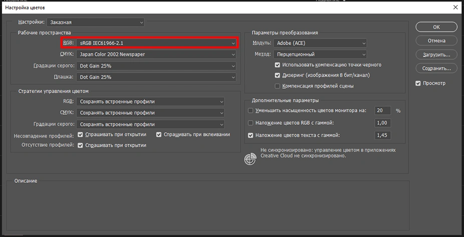 Чтобы выставить в фотошопе рабочее пространство RGB: sRGB IEC61966-2.1 нажмите в русской версии Меню →